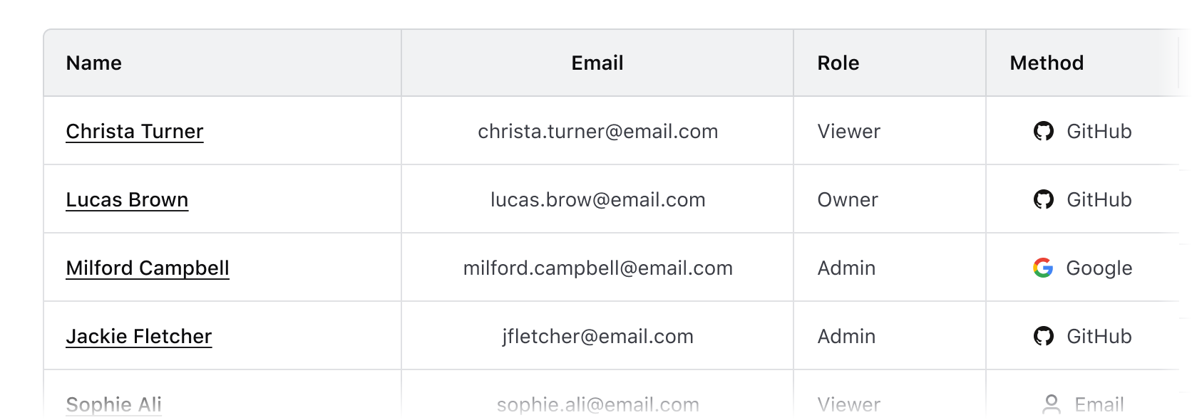 Column width is determined by manually resizing the header column and cells within Figma. As a best practice, column width should be adjusted to fit the longest data type within the cell.